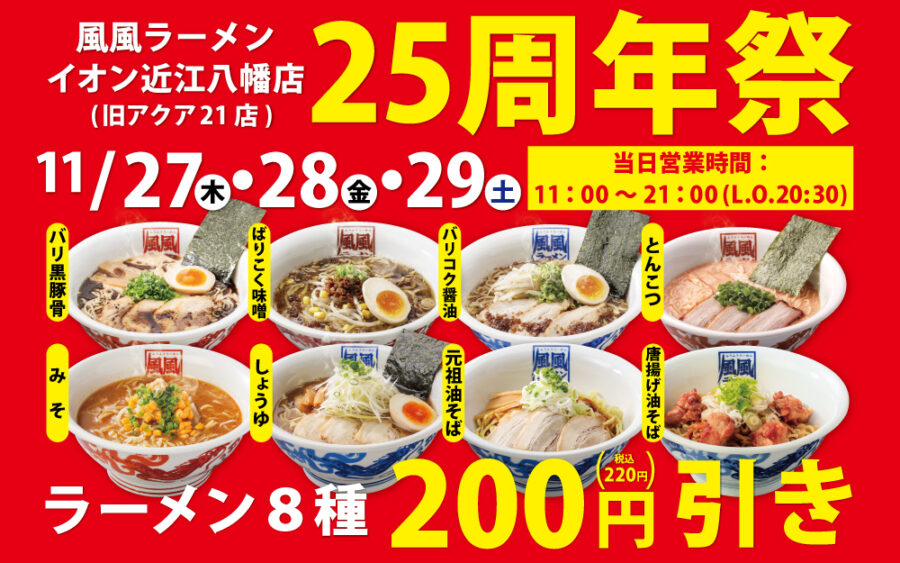 \滋賀県の皆さま大注目/ 風風ラーメンイオン近江八幡店 (旧アクア21店)は おかげさまで25周年 日頃のご愛顧に感謝の気持ちを込めまして 11/27㊍から3日...