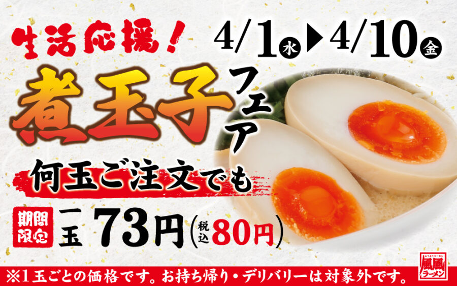 ✨期間限定開催✨\ 生活応援!煮玉子フェア / 4/1(水)〜4/10(金)の期間限定で、人気の煮玉子がお得に楽しめます🍜🥚何玉ご注文でも1玉 73円(税込80...